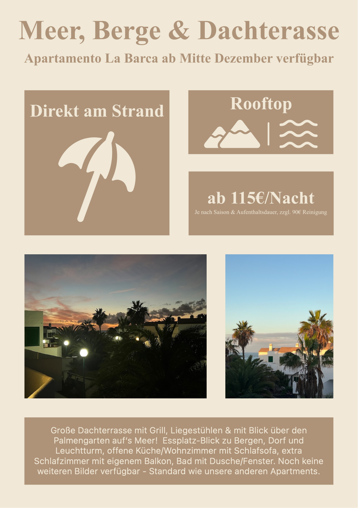 - Große Dachterrasse mit Grill, Liegestühlen & Blick über den Palmengarten aufs Meer
