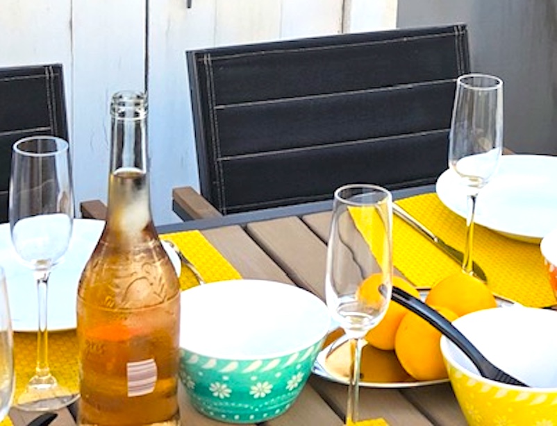 - Große Terrasse mit Markise, Mobiliar und Grill, Hängematte Strand und Meerblick seitlich, Garten, Südausrichtung