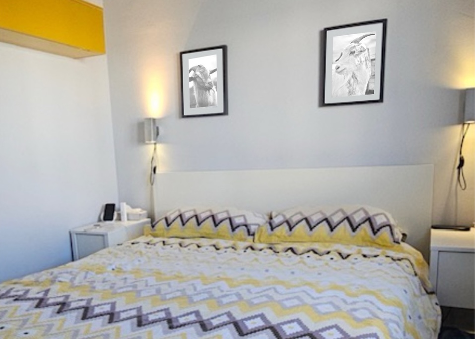 - Schlafzimmer mit Einzel- oder Doppelbett, Schrank, Nachttisch, Bücherregal